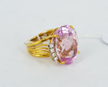 fancy oval cut amethyst of approx 27.00cts set with a vertical row of four round brilliant cut diamonds to either side of the centre stone; no mark valuation stating 18ct gold. Total weight 17g. -