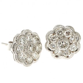 Stamped 585 (14ct) and each earring set with nine round modern brilliant cut diamonds. The scallop mount with milled edge border. TDW 1.76ct approx. Gemologist valuation available upon request. -