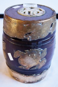 Lot Description:Hardwood barrel shaped, covered tea caddy