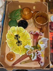 art deco flower frog, pair salt & pepper shakers, 4 vaseline glass epergne trumpets -