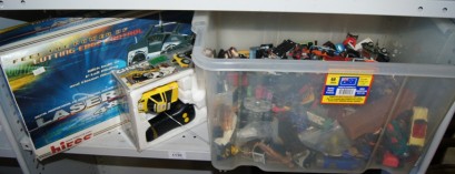 remote control car and plastic container of assorted Matchbox & model cars, many play worn -