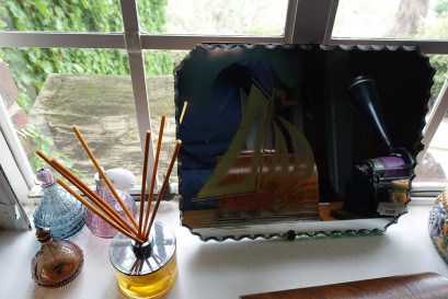 Lot Description:Art Deco etched wall mirror and three coloured glass perfume bottles