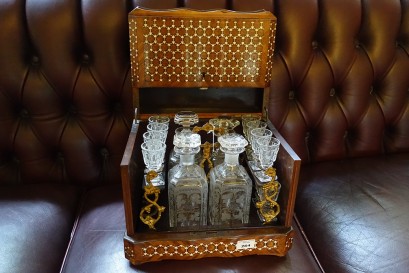 Lot Description:Rare antique French Kingwood and ivory inlaid Tantalus set