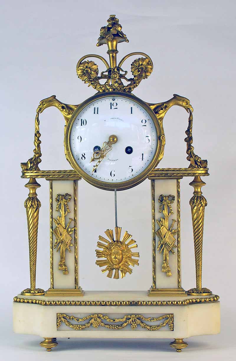 19th century, enamel dial, bronze ormolu mounts, White marble columns, and base 8 day movement, bell striker, sunburst pendulum Height: 46cm -