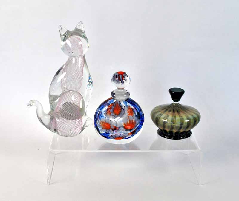 20th century, signed Heights: 6.5cm & 10cm One bottle AF ii) Murano Glass Cat Figure Manufactured Italy, with paper foil label Height: 15.2cm (3) -