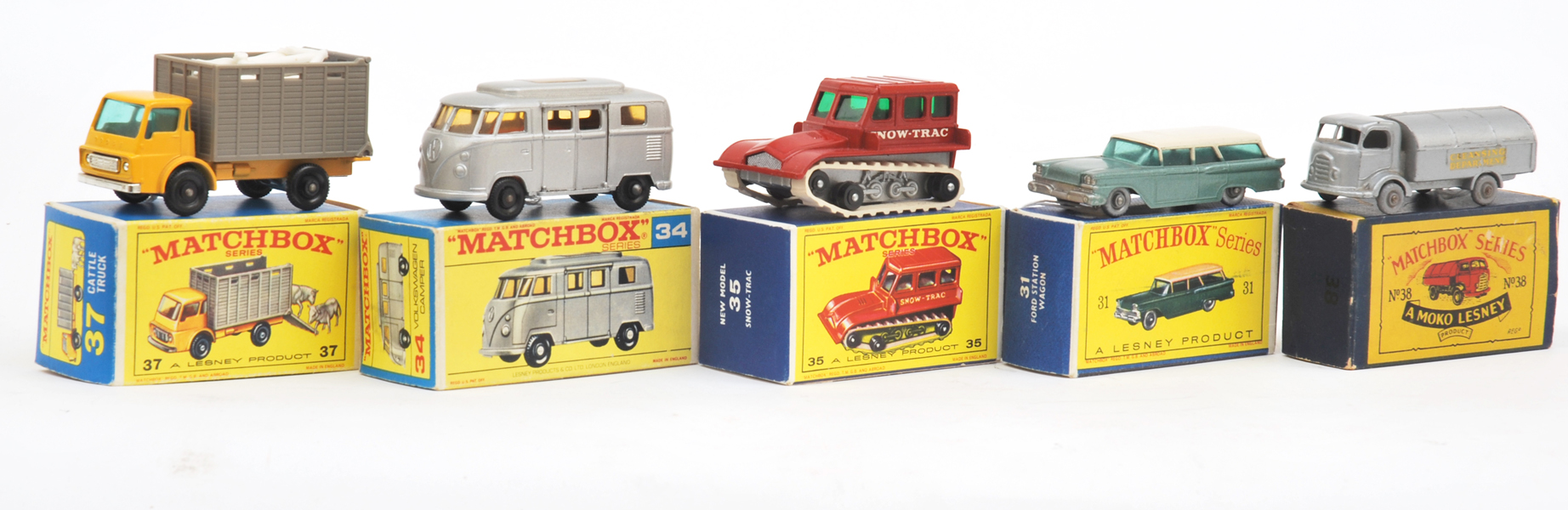 No.31B Two-Tone American Ford Station Wagon; No.34C Volkswagen Camper; No.35B Snow-Trac; No.37C Cattle Truck; And No.38A Karrier Refuse Collector With Red Paint To Base (E-M BOXES F-VG) (5) -