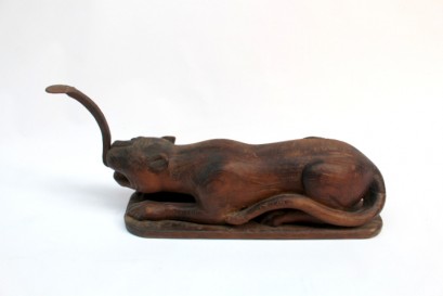 carved in the form of a crouching lion waiting to pounce, in excellent condition with attractive weathered patina