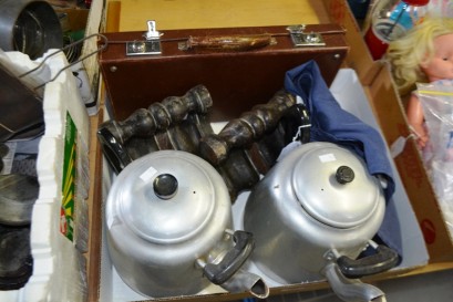 Lot #985 - Box: Australian flag, 2 oversized aluminium teapots
