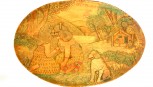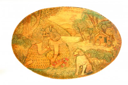 the oval top with Maori figures and whare in a treed landscape, a seated dog included, geometric carved Maori edge, the pedestal has a double-sided Maori stylised figure on a stepped platform base, the top signed and dated 1947, some paint loss. 500 x 330 x 590. -