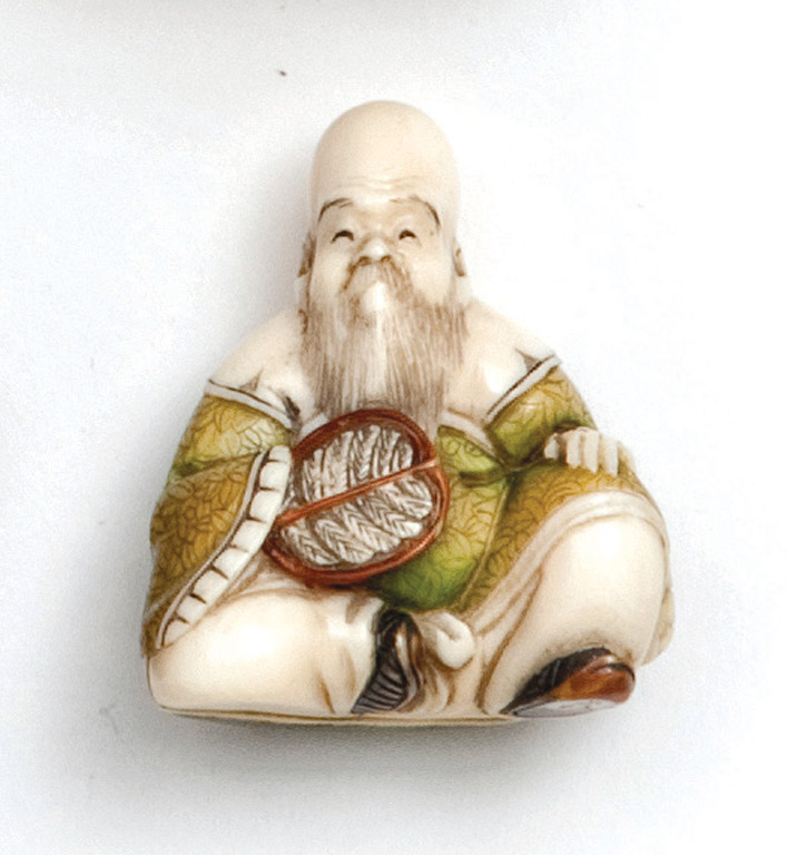 Lot Description:A coloured Japanese ivory netsuke of a sage with a fan, Taisho period (1912-1926)