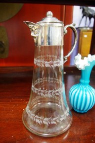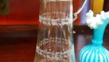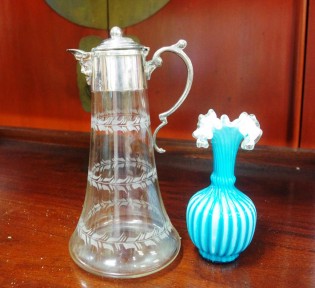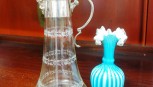 with etched glass, together with a frilled blue vase, 50cm high approx (jug) -