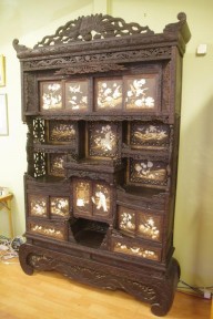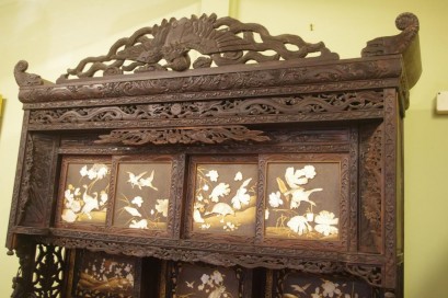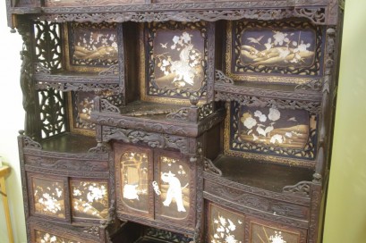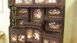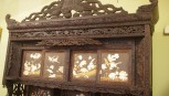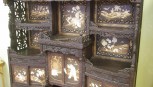 richly carved with scrolling foliage, floral & bird design, the doors & insert panels with applied decoration including shell, separates into 2 parts, 150cm x 34cm, 229cm high approx. -