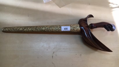 wooden carved handle with jewel styled band to base, with attached blade embossed with 24ct gold. scabbard with curved, flaring top and a n embossed brass wrapped shaft. 51cm L -