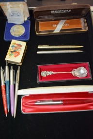 incl. sterling silver example, 1 gold plated, plus a Parker fountain pen etc. Also incl. a Boer war era matchbox holder, a silver rose spoon and a cased tower mint Royal wedding medallion -