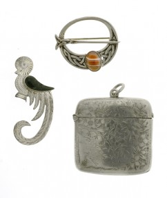 Incl. HMSS Vesta (monogrammed); stone set bird of paradise brooch; & banded agate set brooch. -