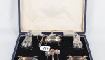 boxed comprising a salt and pepper shaker two salt cellars and a mustard pot with three spoons. Hardy and Brothers Birmingham 1963. Weight 186g. -