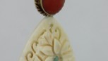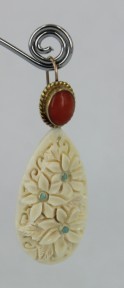coral bail with carved floral ivory drop turquoise flower centres; 9ct gold. -