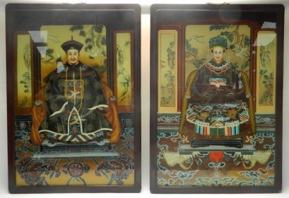 Lot Description:A pair of Chinese Paintings on Glass of a Mandarin & his wife, wearing a civil rank badge with a bird