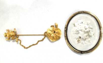 Lot Description:A Gold Plated Frog Brooch together with a Gilt Flower Inlay Brooch