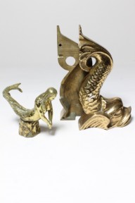Lot Description:A solid brass figure of a mermaid and a pair of cast brass stylised dolphin fire andirons (2)