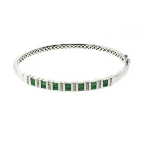 18ct white gold, channel set to the front with baguette cut emeralds and round brilliant-cut diamonds, the emeralds and diamonds weighing together approximately 1.14cts and 0.34cts respectively, stamped '18k 750'