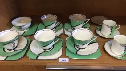 art deco design comprising 5 x teacups & saucers, 6 side plates, 2 coffee cups, 3 saucers, and a sugar bowl -