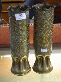 of Gallipoli significance made from German brass shell cases, embossed with foliage, flowers and a bird bearing a banner engraved "Souvenir Chanak 1921' -