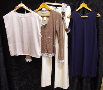 camisole and cardigan together with a Ralph Lauren navy shift dress, a beige pair of tailored pants, silk short sleeve shirt, size 12-14 approx and a shell belt and vintage bow belt -