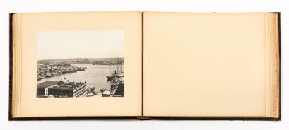 A leather bound, gold embossed album containing 18 photographs by Charles Kerry with subjects including Farm Cove from Govt. House; Circular Quay Looking South, North Shore Ferry Wharf, Circular Quay; Wool Stores, Circular Quay; Horse Ferry, Macquarie Point; Sutherland Dock, Cockatoo Island mostly 15.5 x 20 cm. -