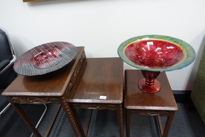 Lot Description:Signed large handpainted green, gold and red footed art glass bowl
