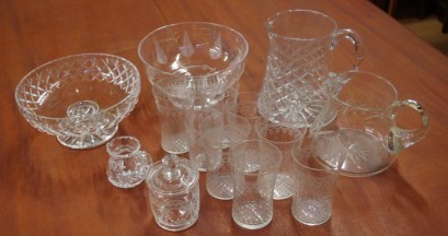 comprising of 3 jugs, 2 comports, 8 glasses and a sugar pot,to include Stuart and pall mall, -