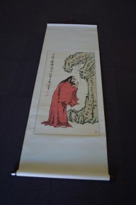 depicting a monk praying next to a rocky outcrop, with calligraphy and red chops, 47.5 w x 96cm H -