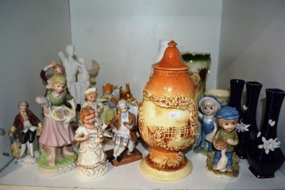 European figurines, ceramic lustre ware ash tray in the form of a horse, vintage glass milk bottle, European floral jug -