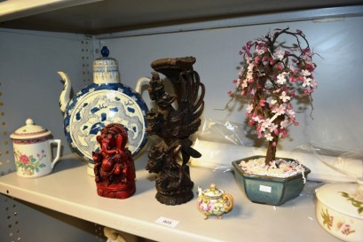 carved timber tribal totem, resin ganesh ornament, Chinese blue & white lidded teapot, scroll -