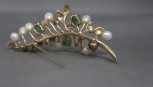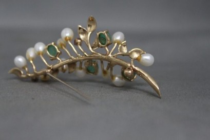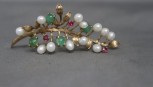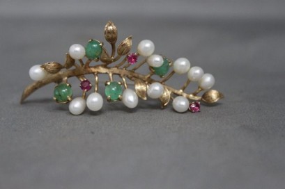 set with river pearls , jade and ruby's modelled in the form of a leaf l 6.5cm -