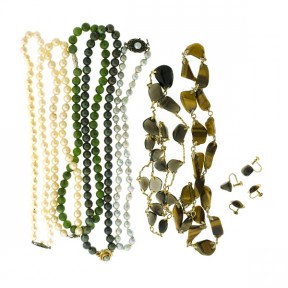 Tiger eye, smokey quartz, 3 pearl, nephrite; & 2 pairs earrings. -