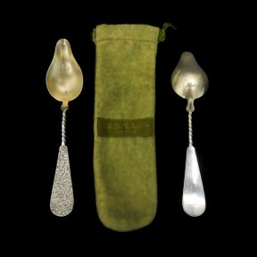 Each with blossom decoration & gilt washed bowls. Monogrammed. Marked "STERLING". In old Tiffany presentation bag.