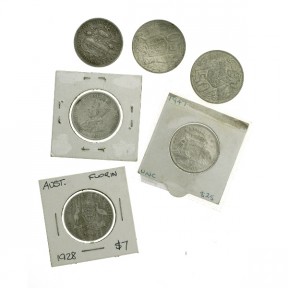 1919 M; 1927 Parliament House; 1928; 1947 UNC florins (4) in total; & 2 round 50 cent pieces. -
