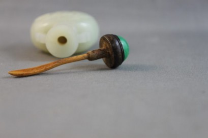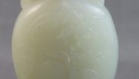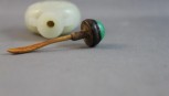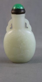 Possibly Qing Dynasty, the bulbous body carved with sprays of peach vines and fruit , underneath dual scrolled handles, fitted with an hardstone and bronzed stopper h 8cm -