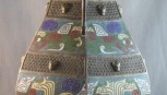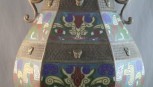 the hexagonal shaped body , fitted with dual figural handles , the incised body interspurced with the enamel plaque inserts h 36cm -