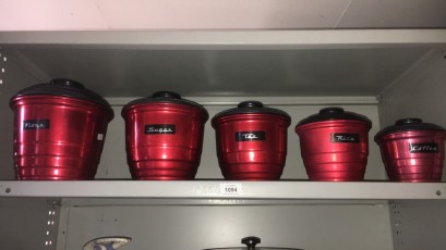 Lot Description:Set of 5 anodised aluminium kitchen canisters