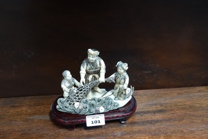 Lot #101 - Japanese ivory carved Okimono of a fisherman with children and fish