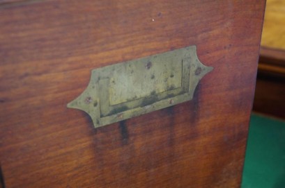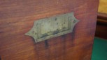 with dark blue velvet lining, brass recessed handles, original key & gilt bronze carrier, 38cm high, 43 wide approx. -