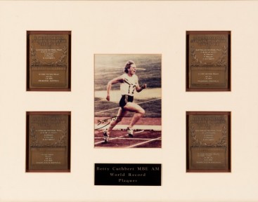 display comprising four World Record plaques awarded to Betty Cuthbert, 4x100m Relay 44.9 seconds 1.12.1956, Melbourne, Australia; 4x100m Relay 44.5 seconds 1.12.1956, Melbourne, Australia (the Australian relay team - Shirley Strickland, Norma Croker, Fleur Mellor & Betty Cuthbert, broke the World Record twice in an hour in the heats at the 1956 Melbourne Olympics); 4x110 Yards Relay 45.6 seconds 5.12.1956 Sydney, Australia; 4x200m Relay/4x220 yards Relay 1minute 36.3 seconds 5.12.1956 Sydney, Australia (The Australian Relay team broke two more World records in the post-Olympics meeting in Sydney - the first team included Shirley Strickland, the second team included Marlene Mathews). Window mounted with a signed photograph of Betty Cuthbert, overall 56x45cm. -