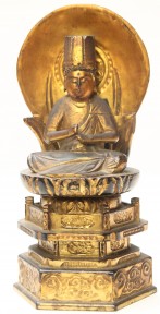 Lot #223 - A Shinto Priest Seated on a Gilt Wood Three Tier Throne with a Circular Halo, Japan, Taisho Period