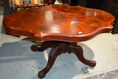 nicely shaped tilt top on turned column base with 4 outswept legs, carved detail, 150cm L -