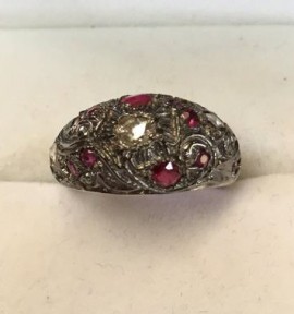 Set with 3 rose cut diamonds and 12 brilliant cut rubies. Ring size: O -