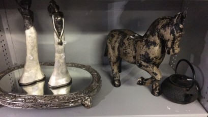 painted timber horse, oval desk stand with silvered finish and beveled edge mirror, 2 modern lady figurines -