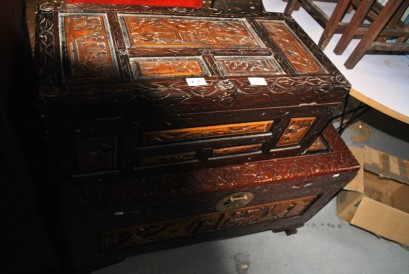 Lot Description:2 camphor wood oriental hand carved timber chests