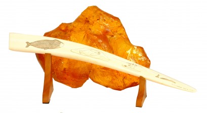 engraved with a whale, walrus and Inuit hunter in kayak. signed Gene Rex & Angnaboogok, Wales, Alaska. Length 470, on wooden mounts. -